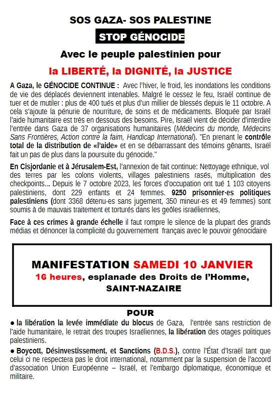 10 janvier 2026 : rassemblements à St Nazaire en faveur du peuple vénézuélien et palestinien 2026-01-09T08:10:50+01:009 janvier 2026|Catégories : À LA UNE, INTERNATIONAL, ST-NAZAIRE|Mots-clés : ACTIONS, MOBILISATION, NANTES, SAINT-NAZAIRE| Communiqué unitaire rassemblement Venezuela Partagez cet article ! FacebookXWhatsAppTelegramEmail Articles similaires POUR44 N° 131 – DECEMBRE 2025 POUR44 N° 131 – DECEMBRE 2025 16 décembre 2025 Jeudi 18 décembre – Journée internationale de soutien aux migrant.es Jeudi 18 décembre – Journée internationale de soutien aux migrant.es 15 décembre 2025 26 et 27 janvier 2026 : STAGE VISA INTERSYNDICAL CGT-FSU-SOLIDAIRES 26 et 27 janvier 2026 : STAGE VISA INTERSYNDICAL CGT-FSU-SOLIDAIRES 4 décembre 2025 CONSULATION PUBLIQUE : exprimez-vous contre le CRA ! CONSULATION PUBLIQUE : exprimez-vous contre le CRA ! 4 décembre 2025 Le 2 décembre toutes et tous mobilisé·es contre l’austérité et pour nos salaires Le 2 décembre toutes et tous mobilisé·es contre l’austérité et pour nos salaires 27 novembre 2025
